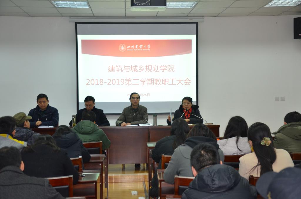 2月26日下午,学院召开新学期全体教职工大会,学习贯彻党中央、省委省政府近期重要文件精神,传达学习学校中心组会议精神及2019年学校工作要点并部署学院新学年工作。学院领导班子及全院教职工出席会议,会议由庄萍萍主持。