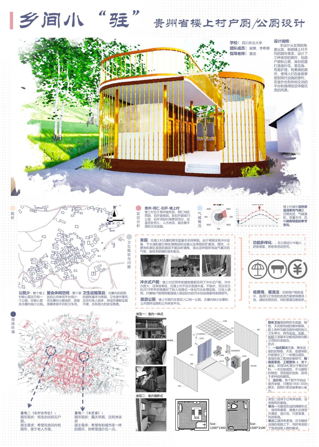 曹迎教授、董翔宇老师指导,2016级建筑学专业组成的参赛团队,从来自同济大学、华南理工大学、重庆大学等国内高校的732个团队中脱颖而出,斩获“乡村户厕设计单元”优胜奖。