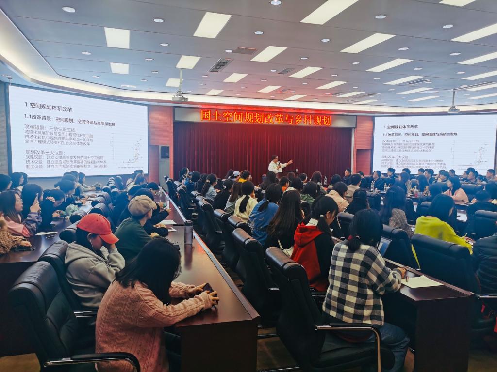 学术交流月”活动,并为全院师生做了题为“国土空间规划改革与乡村规划”的学术报告,此次报告会共吸引了包括兄弟学院在内的近400名师生到场聆听。讲座由学院副院长曹迎教授主持。