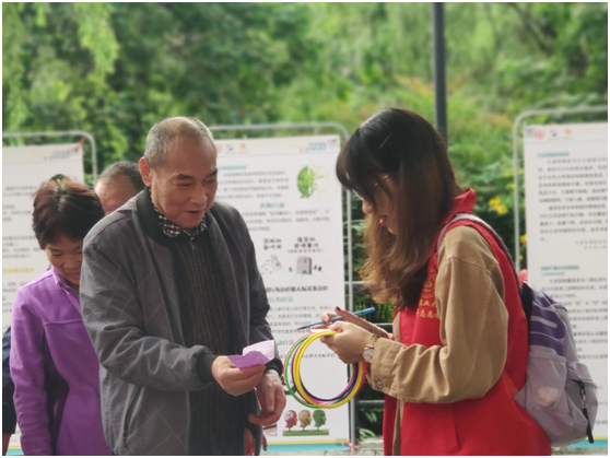 早上8点半,志愿者在学校正门集合并乘车前往华循社会服务中心银杏园小区,在社工的组织下,有序开展活动前的场地布置和礼品摆放。志愿者协助将彩旗拉开、摆上灯笼,灿烂的太阳为小小的场地增添了温暖的气氛。游园活动开始,共分为签到领票和游园游戏两个部分。其中分别有套圈、猜灯谜、掷沙包、蒙眼敲锣四个游戏,每个游戏完成后志愿者负责为老人的游戏票上画勾。四个小游戏虽然简单但是社区老人们却很少有机会能开展这样的游戏,既为他们的生活增添了一份乐趣也是我们志愿服务精神的践行的一种方式。四个游戏结束后,老人根据积分获得了相应的礼品。志愿者也在和工作人员开会后乘车返校。