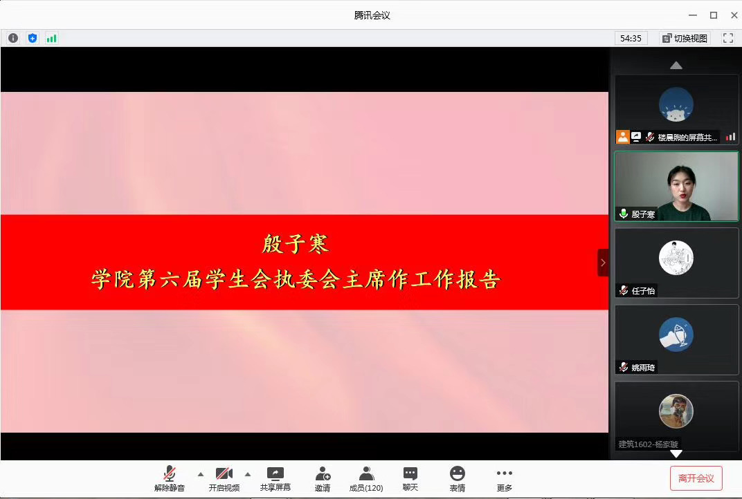 第六届学生会主席殷子寒同学,在会中作了《引领思想潮流,培育青春梦想》的工作报告,报告中提到,学院学生会在院党委的领导下,在院团委的具体指导下,坚持“自我教育,自我管理,自我服务,自我监督”的“四自”方针,发挥学生会作为“学生之家,师生之桥,干部之校”的作用,坚持锐意创新、与时俱进、务实求真的态度,并希望在一届又一届学生会的共同努力下,建城院永葆活力,砥砺前行。
