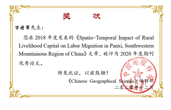 青年教师万将军博士在2018年发表的题为《Spatial-Temporal Impact of Rural Livelihood Capitals on Labor , Migration in Panxi, Southwestern Mountainous Region of China》的文章,经过两年的持续传播,产生了较大的社会影响力,于近日被《中国地理科学》(英文版)评为2020年度优秀论文。