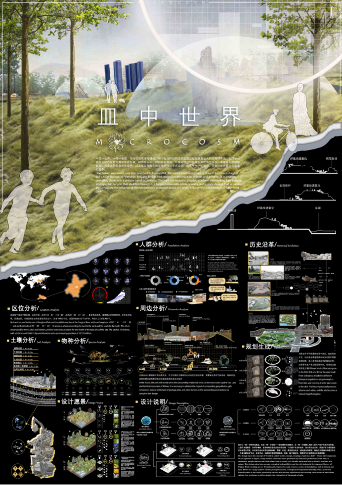 本届大赛由自然资源部人力资源开发中心主办,华中科技大学建筑与城市规划学院、武汉大学城市设计学院、武汉市规划研究院承办。比赛期间,共计156支队伍近900名师生汇聚武汉展开实地调研。团队成员在指导老师的带领下实地调研了杨春湖商务区核心片城市更新单元。在五个月时间内,完成资料整理,详细了解垃圾填埋场处理方式,创新性地提出将土壤处理过程中的微观世界与公园结合,将公园作为人与自然的培养皿,微观世界变化的发生器。场地内设计了大量的时间感受节点、生态分解友好节点,亲水节点,为游览者呈现多样的体验,打造武汉滨水文化新景象。