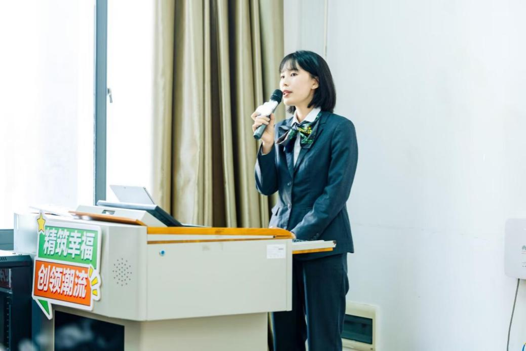 成都分公司项目经理但佳丽女士上台发言。她详细阐述了物业行业的职能与中海物业的诸多优势。从经营业绩稳居行业第一梯队,到全职业生命周期培训体系的完善,再到福利待遇和员工关爱的贴心政策,让同学们对中海物业有了更加全面而深入的了解。