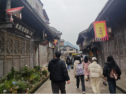 课程调研团队先后来到水磨镇凤凰村、禅寿老街、映秀镇漩口中学遗址。在四川省乡村振兴示范村——水磨镇凤凰村,同学们在村干部的带领下,参观了当地的乡村建设和特色民宿,重点了解了凤凰村的具体规划与实施方案,以及当地发展生态农业和乡村旅游等绿色产业助力当地实现经济转型的实施情况。在水磨古镇的核心区域——禅寿老街,作为灾后重建的成功典范更是多民族文化融合的一条具有独特建筑风格的老街,同学们在这里看到了羌族、藏族和汉族传统建筑元素的完美结合,体验到了“以家带店”的新型商业模式如何促进地方经济发展。此外,老街上还保留了如春风阁、万年台等许多历史遗迹与传统公共空间,这些都为同学们提供了宝贵的研究素材与学习机会。在映秀镇漩口中学遗址,师生们聆听了关于“5·12”汶川特大地震情况的详细讲解,这次特殊的爱国主义教育经历,使每一位参与者都深受触动。震后重建的映秀新景象也引发了同学们在规划中主动考虑抗震因素以及如何更好开展灾后重建的思考。