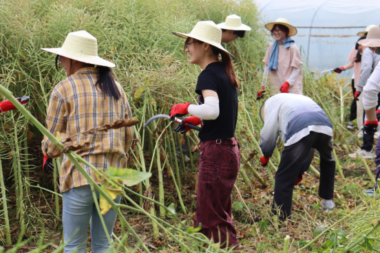 没入齐胸高的油菜丛。从未下地做过农活的同学们起初找不到要领,手上的镰刀迟迟砍不断挺立的油菜杆。时间流逝,田埂上堆积的油菜码成小山,汗水沿脸庞滑落,大家手下的动作也渐渐熟练起来。浅金色的海洋里,跃动的身影与翻飞的草帽,构成了一幅生机勃勃的劳动画卷。难得的下乡体验,增进了城乡规划学生对乡村的了解,培养了动手能力、适应能力及解决问题的能力,进一步拉进学生教育与乡村实践的距离。