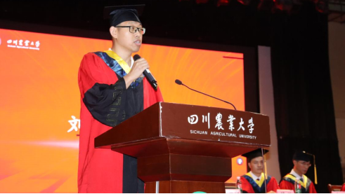 黄领披肩,蓝袍加身。国家奖学金获得者、城乡规划学专业邓坤涛同学代表研究生毕业生发言。他感恩在川农走过的岁月,对校园、师长及后勤工作者们表示衷心感谢。