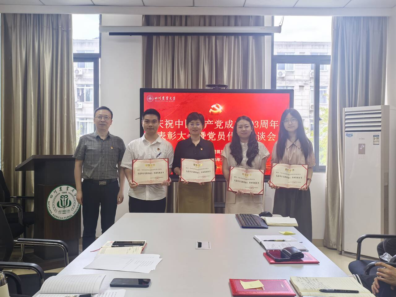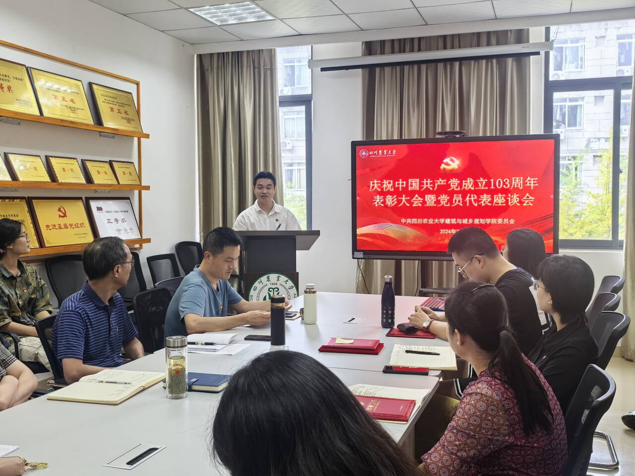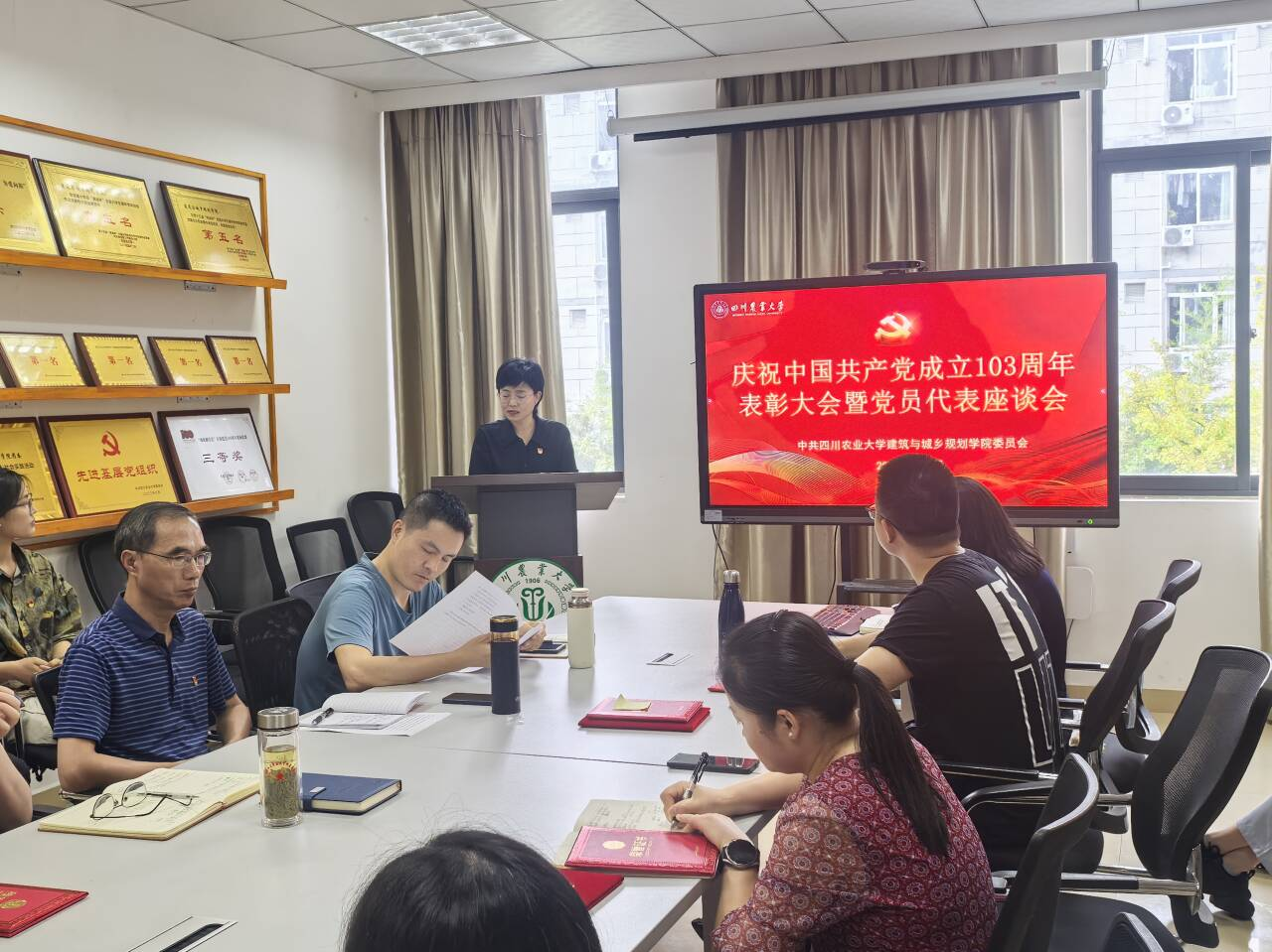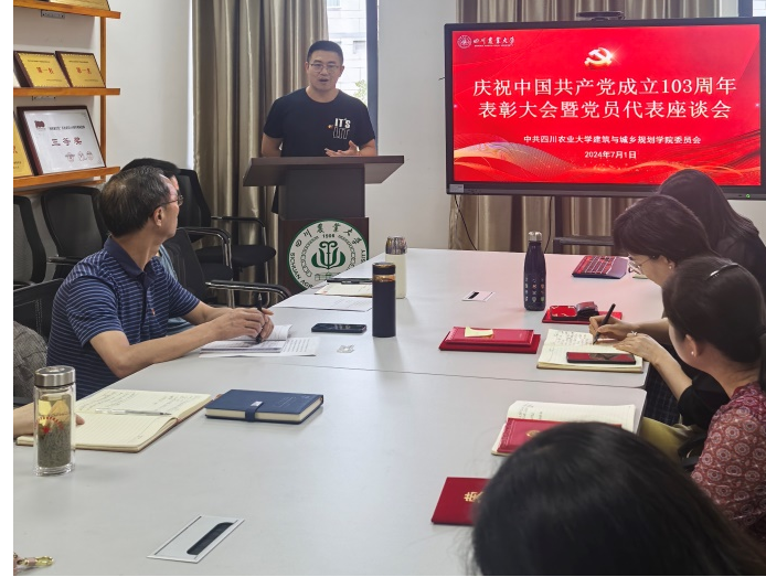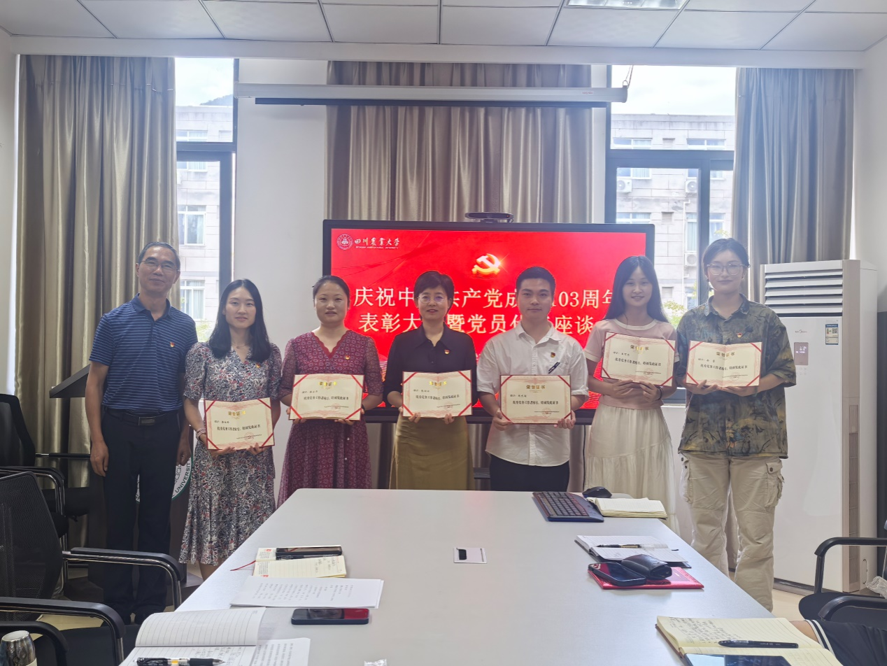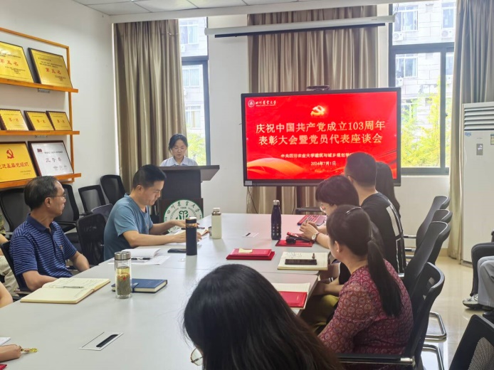在2C307举行庆祝中国共产党成立103周年表彰大会暨党员代表座谈会。学院院长曹云忠、党委书记申琼、党委副书记付刚及各党支部书记、受表彰师生参会,会议由学院党委副书记付刚主持。