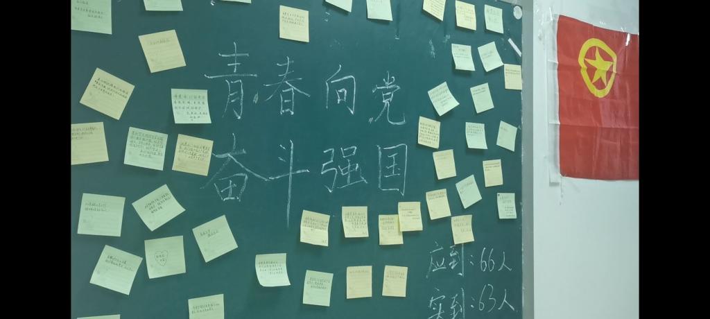 在大家齐唱团歌后,团日活动正式开始,首先由院团委的杨雪老师给同学们进行专题微团课的讲授,从教导青年学子如何系好第一颗扣子出发,再结合赵一曼、郑佑之、江竹筠等优秀革命先辈的故事,引起同学们对本次主题的深刻思考。随后,张泽宇和常文峰同学作为代表分享了家乡的红色故事,让同学们了解到革命先辈开拓革命道路的艰辛。两个支部的同学代表们朗诵诗歌《青春之光》,同学们也纷纷将写在便利贴上的自己想对党说的话贴到黑板上。
