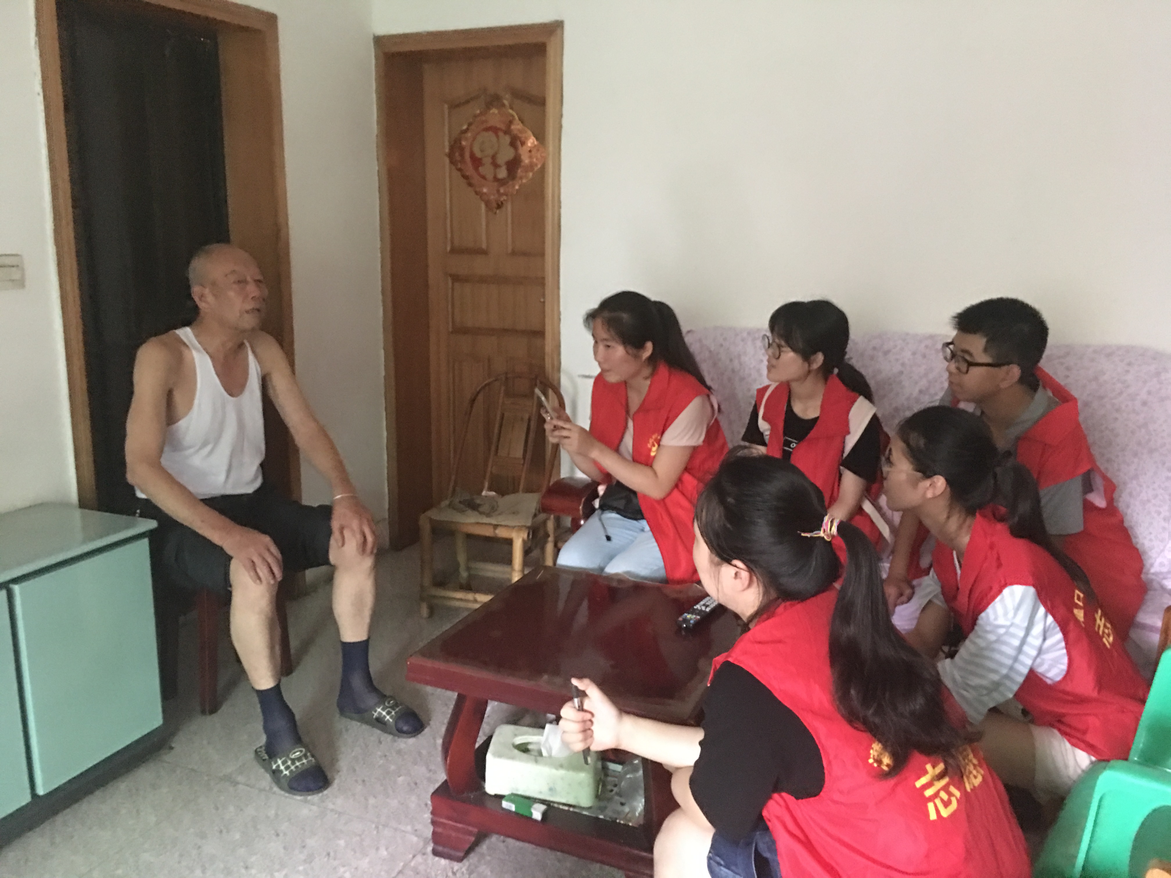 杨大爷今年也是八十多岁了,但身体依然健朗,虽然和儿女分开来住,但他们经常来看杨大爷,时时问候,也没有觉得多孤独。同学刚进杨大爷家时,他很是热情,叫大家坐,吃水果。他平时关注新闻时事比较多,家事国事天下事,事事关心。对于前段时间发生的为争篮球场大爷暴打年轻小伙,杨大爷坚决表明这位大爷的做法是错误的。他说“现在的年轻人学习工作压力大,作为老一辈的人呐,身体能力上支持不了他们,但作为基本的人心换人心、互相体谅的思想总应该懂得吧。”所有队员都被杨大爷的这番话所感动,当我们挥手作别时,杨大爷硬是要拄着拐杖送我们到大门外,看着同学们走远了他才转头回去。