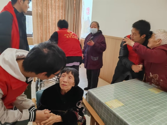 图为小班同学与老人们交流谈心