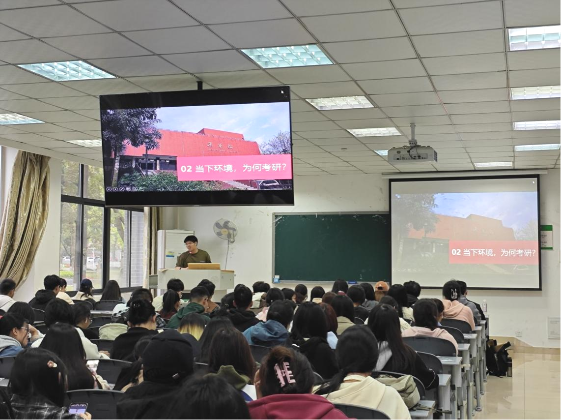 于2024年10月11日在2A101举办了一场关于考研经验分享的专题讲座。此次讲座邀请了现已在重庆大学就读的优秀毕业生杨易,对考研备考进行详尽讲解。