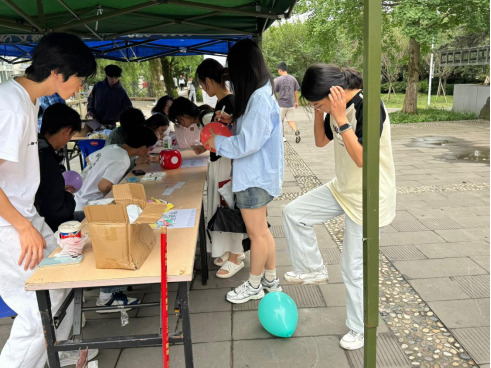 “烦恼粉碎站”人气高涨,同学们在气球上写烦恼后踩爆,释放负面情绪。