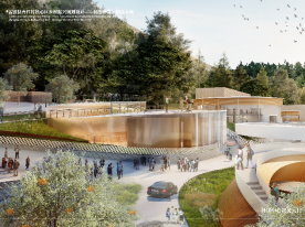 建筑的设计灵感主要来源于山体间星罗棋布的圆形蓄水池和在近似垂直的悬崖上开凿的水渠。以蓄水池的圆为母题,以五个主要的圆屋顶控制整体构图,同时屋顶材质均以水面和镜面构成,通过虚实镜面玻璃和水面映射出水渠和脐橙林,以蜿蜒曲折形似水渠的道路串联起各个圆形功能空间,以方正的墙体承托起圆形的蓄水池屋顶。各个功能块自高而下错落布置,而屋顶的水流也顺建筑层层跌落入下一阶的方正建筑内,最终落入社区的商业中心中,建筑始终呼应着它的主题——道路和屋面交相映带,水瀑映照出的橙影也最终入城。